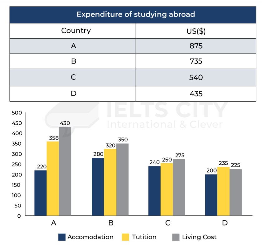 - Paraphrase đề bài: Bảng số liệu hiển thị tổng chi tiêu hàng tuần và biểu đồ cột cung cấp chi tiết các khoản mục chi phí (chỗ ở, học phí, sinh hoạt) của sinh viên tại 4 quốc gia.