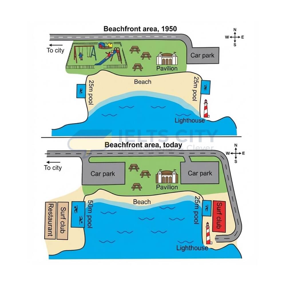 - Dạng bài: Map (Bản đồ) – So sánh sự thay đổi của một địa điểm qua hai thời điểm.