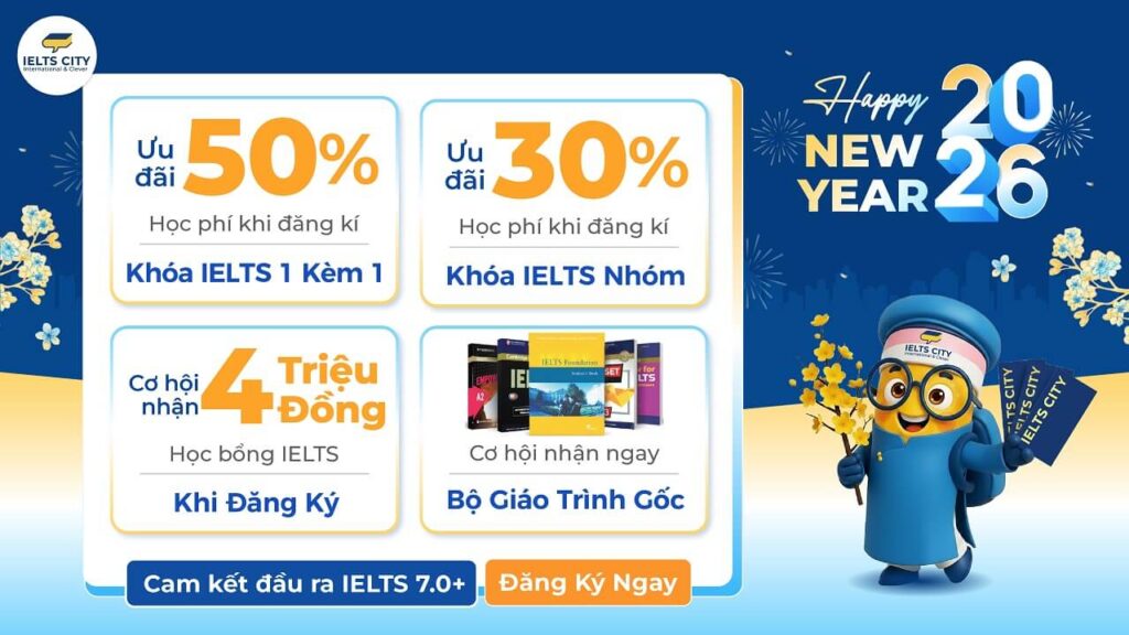 Năm mới rộn ràng, cùng IELTS CITY bứt phá hành trình học tập, chinh phục IELTS 7.0+ và nhận vô vàn ưu đãi đặc biệt nào các quý khách hàng thân yêu ơi!